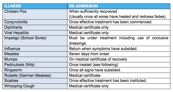 The following ailments require a period of exclusion from school unless a doctor is prepared to issue a medical certificate indicating that the child is free from infection and well enough to return to normal school activities.